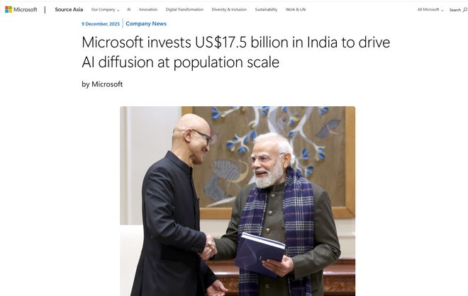 财经新闻网12月10日电(编辑刘锐)美国东部时间周二,微软正式宣布高达230亿美元的新人工智能投资计划,其中包括其在亚洲历史上最大的投资:未来四年(2026年至2029年)将投资175亿美元用于印度的云计算和人工智能,帮助该国实现智能化的目标。此外,微软还计划未来两年在加拿大投资超过75亿加元(约合54.2亿美元),使该公司2023年至2027年在加拿大的AI投资总额达到190亿加元(约合137亿美元)。图为相关报道截图。微软计划在印度大力投资。最近,微软首席执行官萨蒂亚纳德拉对印度进行了为期三天的访问。在此期间,他会见了印度多位官员,并将参加在技术中心班加罗尔和菲纳举行的情报主题活动孟买国家中心。纳德拉在新德里会见印度总理纳伦德拉·莫迪后,在 X post 宣布了在印度投资的计划。纳德拉宣布计划投资印度 纳德拉表示,微软正在进行这些投资,以帮助印度发展人工智能发展所需的“基础设施、技能和主权能力”。印度已成为世界上增长最快的数字市场之一,这一公告凸显了主要科技公司之间的全球扩张竞赛。今年10月,谷歌表示,明年五年内将在印度投资150亿美元,在该国建立第一个人工智能中心。该人工智能中心将位于南部城市维沙卡帕特南,将成为谷歌全球最大的中心之一。印度正在积极吸引人工智能投资。随着人工智能的兴起,印度制定了雄心勃勃的目标,要成为全球领先的人工智能中心智能和半导体制造。印度政府推出了财政激励措施,旨在吸引全球芯片制造商和大型科技公司加强该国的创新生态系统、增加就业机会并减少对进口技术的依赖。莫迪告诉微软,“在人工智能领域,全世界都看好印度。”微软在印度运营已有三十多年历史,在该国拥有超过22,000名员工,并且正在扩大云和数据中心容量,以满足先进的计算需求。微软在一份声明中表示,预计将扩大其在印度的现有业务。该公司计划于 2026 年中期推出新数据中心,建立印度最大的超大规模企业。具体来说,微软将在印度第五大城市海得拉巴建设一个新的数据中心。它将成为印度最大的超大规模数据中心,预计将于 2026 年中期投入运营。公司拥有公司还将扩建位于钦奈、海得拉巴和浦那的三个现有数据中心,并履行今年 1 月做出的承诺,即到 2030 年为 2000 万印度人配备必要的人工智能技能。 据房地产 Collier Collier 称,到 2030 年,印度数据总容量预计将增加两倍以上,达到约 4.5 吉瓦。 1 吉瓦的计算能力几乎足以为美国 75 万户家庭供电。向加拿大投资75亿加元 微软当天早些时候表示,未来两年将在加拿大投资超过75亿加元(54.2亿美元),投资下的新云产能预计将于2026年下半年上线。此举是微软2023年至2027年在加拿大整体投资计划190亿加元的一部分。微软还与加拿大AI初创公司Cohere合作使公司的先进人工智能模型在 Azure 平台上可用。