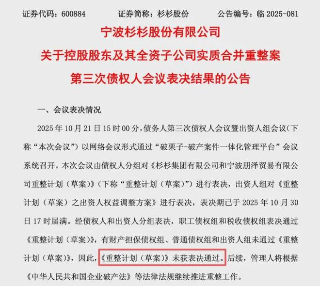 决定杉杉集团前途命运的债权人会议召开了。结果,重组方案一票未获通过。以72岁“船王”任元林为首的新长江商社,试图控制杉杉股份也惨遭失败。重组草案被否决。 11月3日晚,杉杉股份公布了控股股东杉杉集团及宁波鹏泽商贸全部财产的投票结果。公告显示,重组方案草案“未能通过表决”,这意味着杉杉集团的重组方案将被搁置。尽管重组方案被否决,但公告表示,未来重组管理人将根据相关法律法规的规定,继续推进重组工作。根据公告,掸族失败的主要反对派韩集团的方案草案来自三股力量,分别是担保债权群体、普通债权群体和投资人群体。据《每日经济新闻》报道,上述债权组未能通过草案的主要原因是债权人对偿付比例不满意;在与债权团体、投资者团体的谈判中,很难协调多方利益。根据此前披露的《重组方案(草案)》,以江苏新扬子商贸牵头,江苏新扬造船、厦门TCL实业、中国东方资产组成的财团拟收购杉杉集团持有的杉杉股份合计23.36%的控制权。根据上述预案,重组投资者将通过投资者分销平台持股、合伙持股和直接持股等方式获得共计约2.87亿股股份。ngs。本次受让股份对价约为32.84亿元,即每股11.44元。若重组成功,控股平台将成为杉杉股份控股股东;新扬子商贸实际控制人任元林将成为杉杉股份实际控制人。任元林是扬子江船业集团创始人、名誉董事长。他拥有近50年的造船行业经验,在业内被称为“中国民营航运大王”。供货商供应商张武(化名)告诉界面新闻,作为与杉杉股份有业务往来、将保留股份的债权人,他希望未来上市公司的业务能不断向好。但在他看来,新扬子商贸选择接手杉杉股份,更倾向于金融投资。扬子新商贸本身投入的资金并不多,及股权购买比例sed并不大,不到10%。从这一点来看,要么是缺乏信心,要么是重组投资被认为是金融投资。杉杉集团重组是否会被推翻并开始?在外界看来,这种拒绝是出乎意料的。有猜测称,本次重组的失败可能与参与其中的Symeco提起的诉讼有关。此前,10月15日,赛迈克向宁波市鄞州区法院提起诉讼,称尽管公司成功落户的投标联合体竞标,但赛迈克的安排被新的TCL产业安排所取代,而公司并不知晓新重组协议的签署。请求鄞州区人民法院裁定该重整方案无效。值得注意的是,据每日经济新闻报道,所谓“塞马科在不知情的情况下被踢了”是虚假信息。一个此后,虽然法院和重组管理人召开会议说明情况并继续进行债权人投票,但仅就情况说明并没有消除债权人对于收购方案的担忧。值得注意的是,是否重新筹划和解继续执行仍需由宁波市鄞州区法院来决定。根据《中华人民共和国企业破产法》第八十七条规定,即使债权人会议表决部分未能通过重整计划草案,在一定条件下,法院仍可以强制批准该计划。知情人士表示,虽然理论上法院有被迫批准该计划的可能性,但一般针对的是少数群体未通过的案件,而此时三大主要群体均未能通过,因此有可能法院被迫批准该计划的可能性很低。接下来,杉杉集团的重组进程可以从头开始。前三季度净利润同比增长1121%。 2025年第三季度,杉杉股份实现营业收入49.51亿元,较去年同期的44.64亿元增长10.91%;归属于上市公司股东的净利润为762890万元,较上年同期的556.52万元大幅增长1253.04%;归属于上市公司股东的扣除非经常性损益的净利润为5409.92万元,比上年同期的1242.6万元增长335.36%。第三季度,公司总营收同比增长193.69%,主要得益于偏光片业务高价值产品出货量大幅增长。同时,产品结构的优化结构和严格的成本控制共同推动了凯博盈利的提升。前三季度总收入同比增长225.35%。一方面是因为负极材料业务销量实现大幅增长。公司通过推动综合大基地产能释放、优化生产流程等措施,实现了有效的成本优化,盈利水平同比提升。另一方面,今年以来非主营业务整体亏损规模有所收窄。经营现金流方面,公司2025年前三季度经营活动产生的现金流量净额为23.55亿元,较上年同期的10.03亿元增长134.69%。这主要是由于电极业务负收入增加,导致付款增加。同时,公司提高了我提升供应链管理水平,严格控制账期采购期限,强化销售回款,经营活动现金流状况进一步改善。经过近两年的内斗,杉杉的业绩有了很大的提高,这是一个好兆头。目前面临的最大的不确定风险是未来重组能否成功?