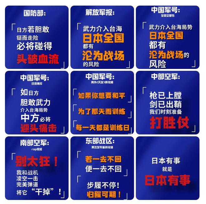 近期,国防部、解放军报、中国军号、南方空军、中央空军、东部战区等官方账号纷纷在海内外发出声音。防卫省:日本若敢冒险,将遭受血腥打击解放军报记者:随着武装介入台海,整个日本面临成为战场的危险。中国军喇叭用英文警告:如果部队介入台海局势,整个日本都有沦为战场的危险。 《中国军号》发布日文海报:日本若敢武力介入台海局势,中国必出击! 《中国军号》两天内在国外发布了三个视频,并配文:“如果你想要和平”、“为那一天训练”和“每一天都是训练日”。南方空军发布说唱《别疯》:战斗机解放军我和ne以完美的弹道齐射,“杀死”了它。中央空军:枪已经上膛,刀却没有被注意到。我们时刻准备着打赢这场战争!东部战区发布重磅视频《如果走了就不再回来》和《归来》,并配文:继续前行!回程可期(来源:北京日报)