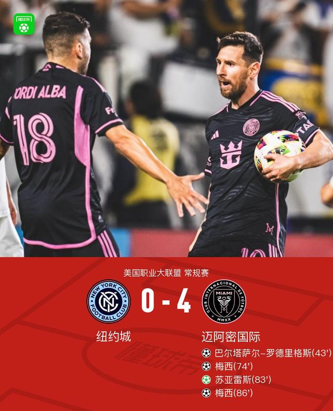 北京时间是9月25日,即美国美国职业棒球大联盟的常规时期,纽约市在国内对阵迈阿密国际比赛。梅西(Messi)直接传球并在上半场提供了帮助,巴塔斯尔(Bartasal)打进了一个进球。在下半场,公交车直接传球,梅西(Messi)射门得分,然后迪普尔(Depaul)得分,苏亚雷斯(Suarez)抓住了点球,然后梅西(Messi)用一条龙打破了点球,并得分完成了双射。最终,迈阿密国际队以4-0击败纽约市。 In the 43rd Minute of the key event, Messi made a straight pass and assists, Bartasal scored a single goal, Miami International 1-0 in the 74th minute, busquets made a straight pass, Messi scored a single shot, Miami International 2-0 in the 83rd Minute, Depaul Made a Point, Suarez Took The Penalty, Miami International international 3-0In the 86th Minute, Messi broke into the penalty area and再次得分,迈阿密国际队在纽约令人惊叹的时刻4-0城市,双方的球员进入球场,比赛在第二分钟开始,西尔维蒂(Silveti hit by Penia in the arm, then covered his face and fell to the ground for the 30th minute, missing a good opportunity, Nicholas Fernandez had an excellent chance to shoot, the ball hit the goal frame in the 38th Minute, Messi scorated SCORED SCORED SCORED SCORED SCORED SCORED SCORED SCORED SCORED SCORED SCORED SCORED SCORED SCORED A free kick, the ball was saved by Fritz in the 49th minute, Messi passed the ball,苏亚雷斯在罚球区前射中,球在第66分钟被弗里茨(Fritz)救了,巴塔萨尔(Bartasarth minute, O'Toole's shooting with a shot, the ball saved Ustari in the 86th minute, Messi crossed a pick, Allende had a great chance to hit the goal in 90th + 1 minute, Messi stopped the ball in the midfield and dropped the ball directly, and Messi was stuck in Fitz at 90th + 4 City the ball in the punishment area and shot outside the instep, the ball hit the goal frame, the technical team statistics
