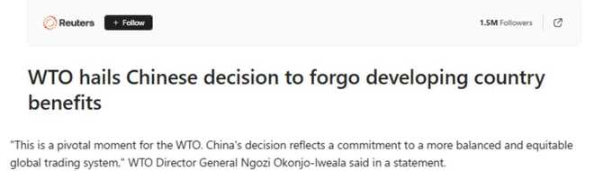 9月23日,当地时间,中国在参加第80联合国大会的相关活动时认真宣布世界,作为一个负责任的主要发展中国家,中国并未寻求对当前和未来WTO结论的新的特殊和差异不同的待遇。中国的决定吸引了许多外国媒体的注意。路透社发表了一篇文章,目前,世界贸易组织的成员正在考虑进行全面的改革,以使这家全球贸易机构的兴奋感下来。该组织目前正在面临美国政府实施的一系列关税步骤的挑战。该报告引用了世贸组织总监Okonjo-Avera总监说,这对WTO来说是关键时刻。中国的决定反映了其承诺,这是一个更加平衡和平等的全球贸易体系。路透社的屏幕截图报道了新加坡的海峡时间,即中国在做出这一决定时,联合各州政府正在实施单方面关税措施,违反了世界贸易组织规则和美国与全球自由贸易体系偏离的技能。斯蒂芬·奥尔森(Stephen Olsen)访问了尤索夫伊萨(Yusov Isa)东南亚学者的访问,他指出,中国宣布“没有特殊”步骤的消息无疑正在增强其国际证书。 Singapore's Straits Times Screenshot reports Malaysia Star reported to have quoted insider industry that says the transfer of China is not only to promote the motionless reform in the WTO, but also to promote one's own pthe -economic and upgrading of higher standards.同时,这也是对国际社会期望的积极回应。马来西亚明星屏幕快照屏幕快照由Wang Huanxing评论翻译| Wang Qian Gao Jiayi生产商| Zou Haoyu